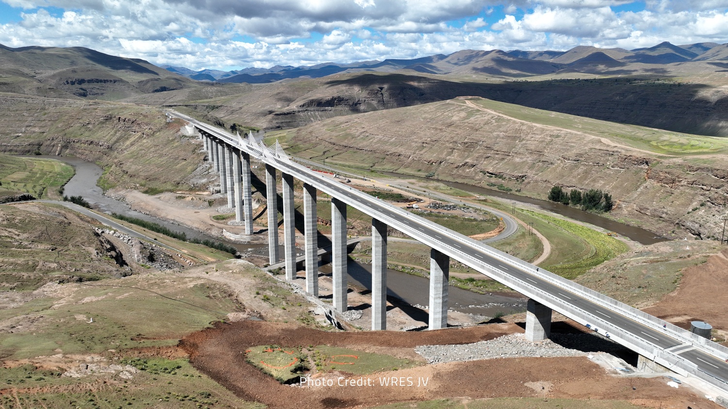 Spanning 825 metres across the Senqu River valley, the bridge is the longest and highest in Lesotho, rising more than 90 metres above the valley floor. Designed as an extradosed cable-stayed structure, the bridge has been engineered to withstand the extreme conditions of Lesotho’s mountainous terrain while ensuring uninterrupted connectivity along the national A1 route.